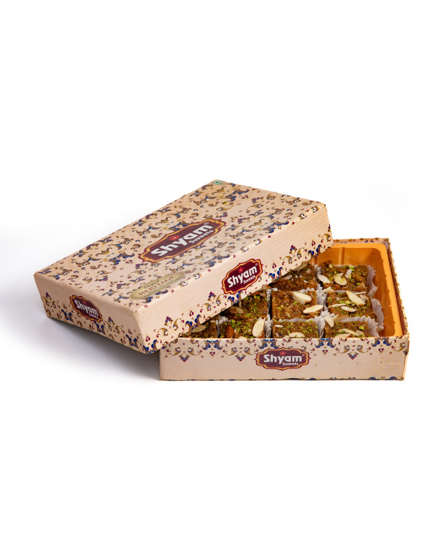 Dodha Barfi is a beloved Punjabi delicacy made by slow-cooking full cream milk with ghee, sugar, and dry fruits until it reaches a rich, caramelized texture. Its signature grainy yet fudgy consistency, combined with a nutty crunch, sets it apart from other Indian sweets. Packed with the flavor of roasted khoya and generously studded with almonds and cashews, Dodha Barfi is perfect for festivals, weddings, or simply to indulge your sweet cravings.